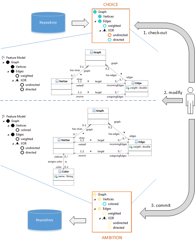 Folgendes Beispiel illustriert diese Vorgehensweise: Zunächst wird eine bestimmte Version eines Klassendiagramms für Graphen ausgescheckt, ein gerichteter gewichteter Graph. Im Anschluss wird das Feature „colored“ (gefärbte Graphen) im Featuremodell definiert und im Klassendiagramm umgesetzt. Zum Schluss werden diese Änderungen unter einer Featurekonfiguration übertragen, die die Änderungen mit dem Feature „colored“ verknüpft. Infolgedessen werden die erbrachten Änderungen nur für Varianten gültig sein, die das Feature „colored“ enthalten.